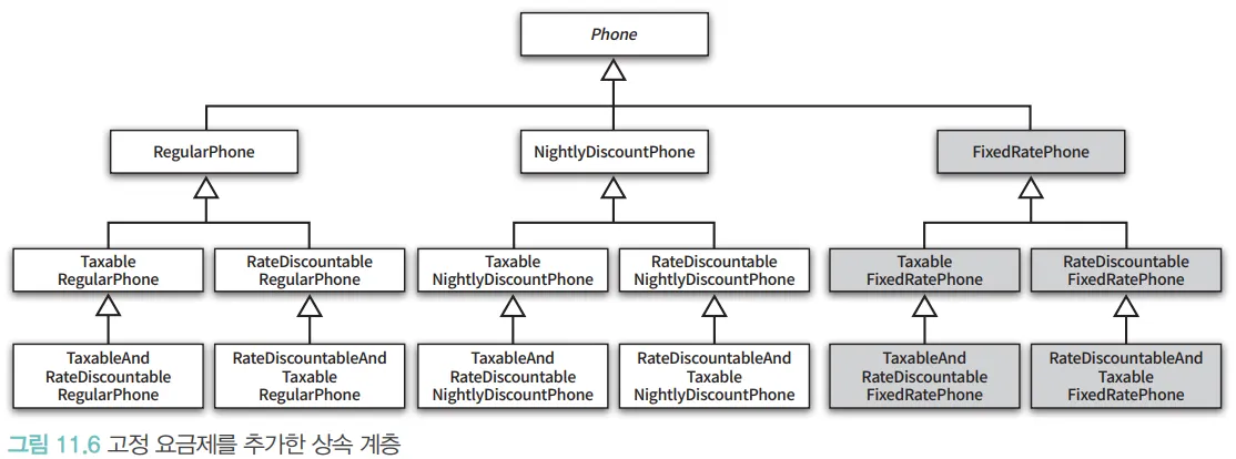 따라서 여러 기능을 조합해야 하는 설계에 상속을 이용하면 모든 조합 가능한 경우별로 클래스를 추가해야 한다.