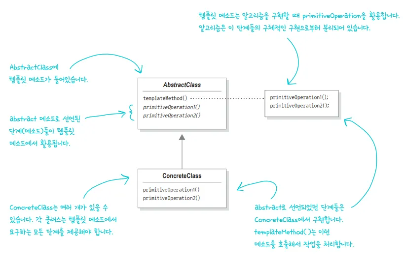 알고리즘의 구조는 그대로 유지하면서 알고리즘의 특정 단계를 서브클래스에서 재정의 가능