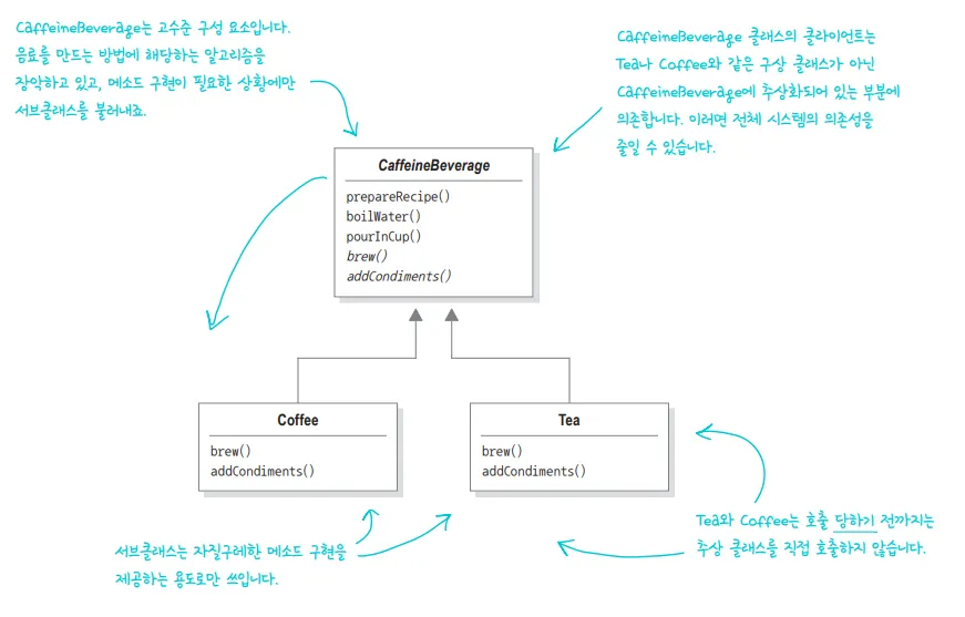 public class Tea extends CaffeineBeverage { public void brew() { System.out.println("찻잎을 우려내는 중"); } public void addCondiments() { System.out.println("레몬을 추가하는 중"); } }