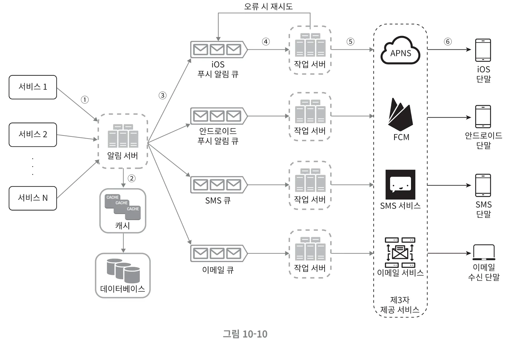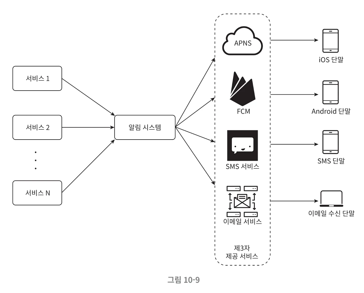 이 시스템은 서비스 1~N에 알림 전송을 위한 API를 제공해야 하고, 제 3자 서비스에 전달할 알림 페이로드를 만들어 낼 수 있어야 한다.