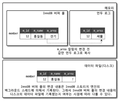 그리고 디스크의 데이터 파일에는 체크포인트나 InnoDB의 Write 스레드에 의해 새로운 값으로 업데이트돼 있을 수도 아닐 수도 있다.