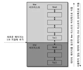 ‘Old 서브리스트’ 영역은 LRU 에 해당하며, ‘New 서브리스트’ 영역은 MRU 정도로 이해하면 된다.