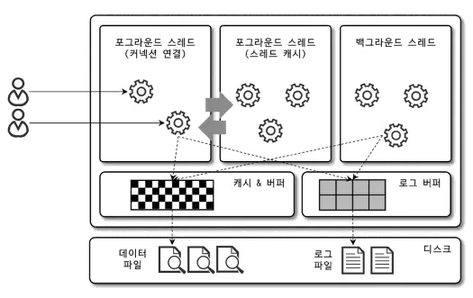 이 중 가장 중요한 것은 로그 스레드와 버퍼 데이터를 디스크로 내려쓰는 작업을 처리하는 쓰기 스레드일 것이다.
