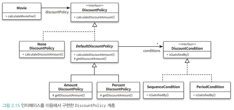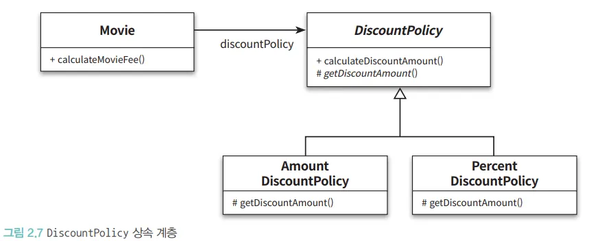 public abstract class DiscountPolicy { private List<DiscountCondition> conditions = new ArrayList<>(); public DiscountPolicy(DiscountCondition ... conditions) { this.conditions = Arrays.asList(conditions); } public Monet calculateDiscountAmount(Screening screening) { for(DiscountCondition each : conditions) { if (each.isSatisfiedBy(screening)) { return getDiscountAmount(screening); } } return Money.ZERO; } abstract protected Money getDiscountAmount(Screeing screening); }