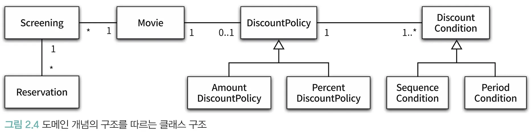 그림을 하나의 문장으로 정리하면 “영화 예매 요금은 최대 하나의 ‘할인 정책’과 다수의 ‘할인 조건’을 이용해 계산할 수 있다.”