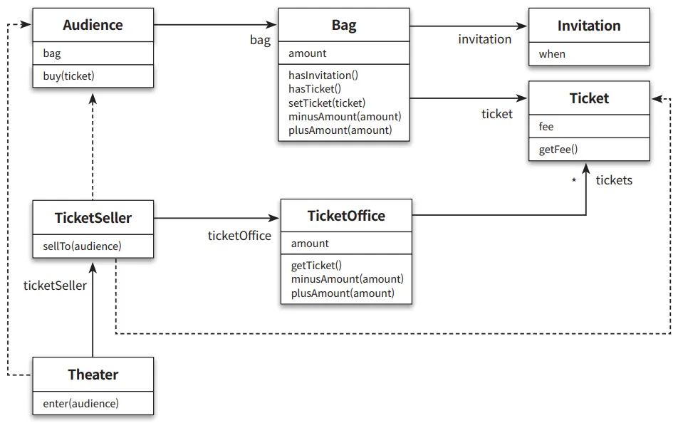 public class Audience { private Bag bag; public Audience(Bag bag) { this.bag = bag; } public Long buy(Ticket ticket) { if(bag.hasInvitation()) { bag.getTicket(ticket); return 0; } else { bag.minusAmount(ticket.getFee()); bag.setTicket(ticket); return ticket.getFee(); } } } public class TheaterSeller { private TicketOffice ticketOffice; public Theater(TicketOffice ticketOffice) { this.ticketOffice = ticketOffice; } public void sellTo(Audience audience) { iticketOffice.plusAmount(audience.buy(ticketOffice.getTicket())); } } public class Theater { private TicketSeller ticketSeller; public Theater(TicketSeller ticketSeller) { this.ticketSeller = ticketSeller; } public void enter(Audience audience) { ticketSeller.sellTo(audience); } }