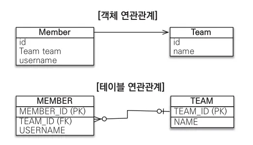 반면 테이블은 외래 키를 사용해 테이블과 연관관계를 가지고 조인을 사용해 연관된 테이블을 조회한다.