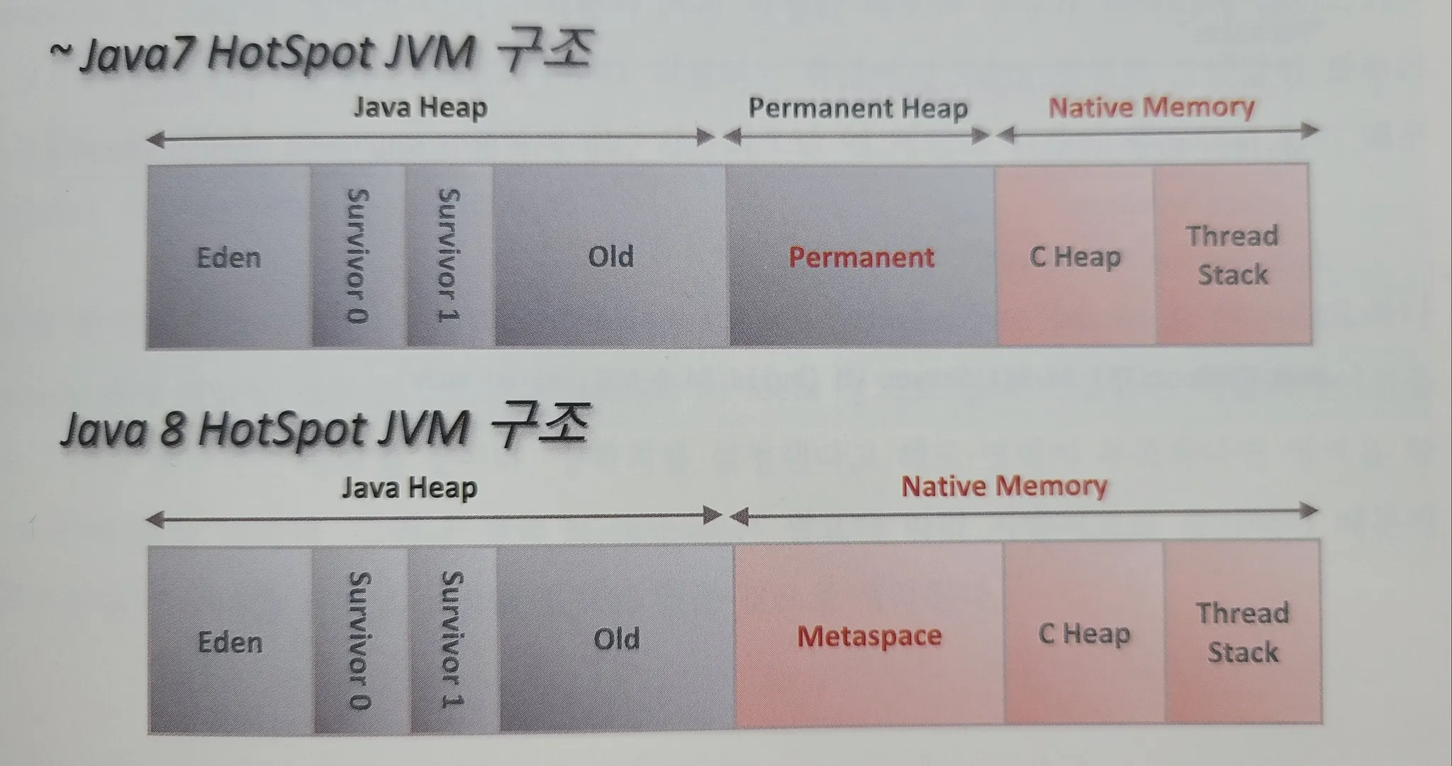 자바 8에서 JVM 메모리 구조적 개선사항으로 Perm 영역이 Metaspace영역으로 전환되어 Perm 영역은 사라지게 되었다.