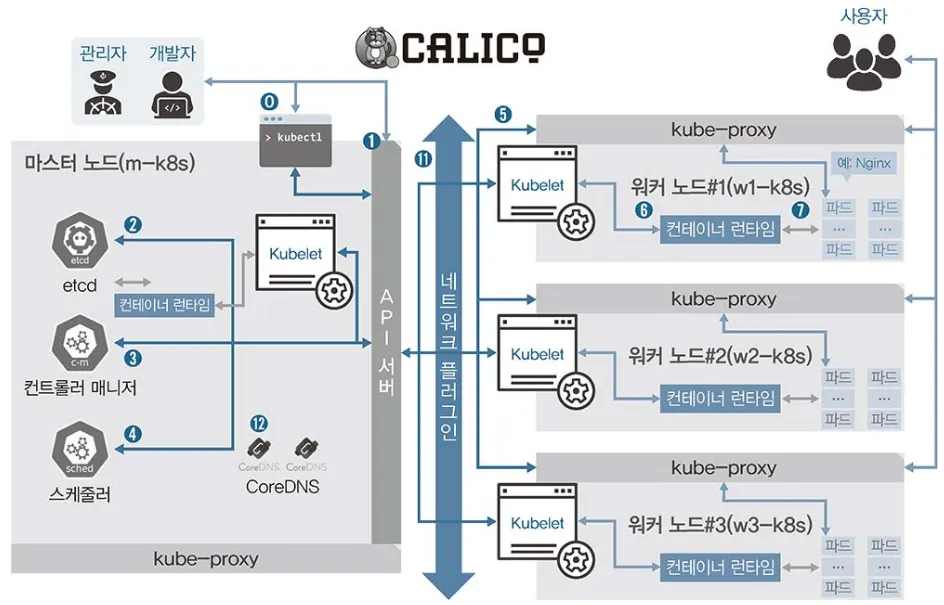 네트워크 플러그인 : 쿠버네티스 클러스터의 통신을 위해 네트워크 플러그인을 선택하고 구성할 수 있음
