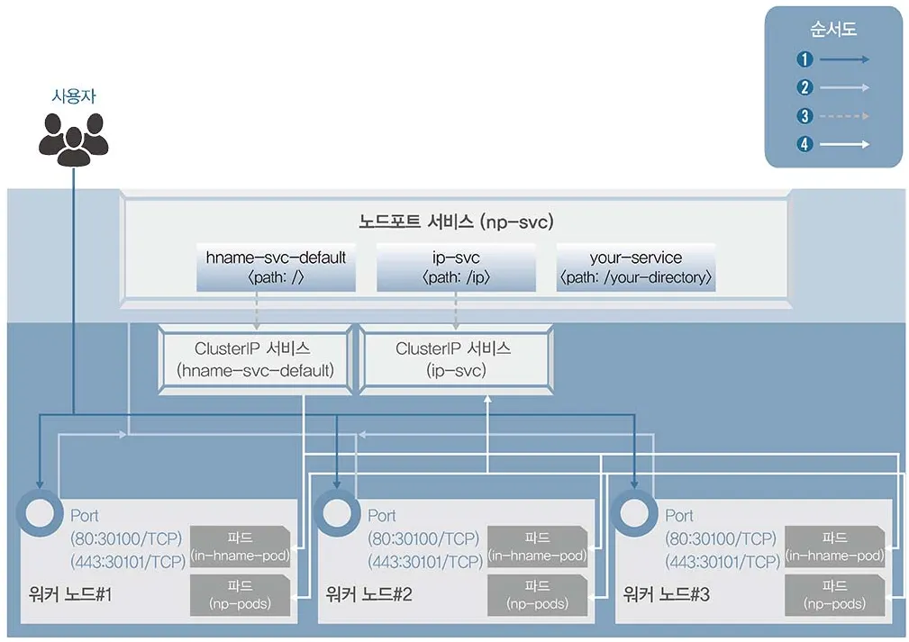 앞서 배운 방식은 들어오는 요청을 모두 워커 노드의 노드포트를 통해 노드포트 서비스로 이동하고 이를 다시 쿠버네티스의 파드로 보내는 구조
