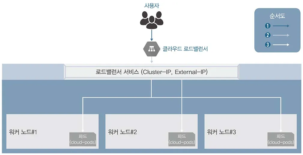 때문에 쿠버네티스에서는 로그밸런서라는 서비스 타입을 제공해 간단하 구조로 파드를 외부에 노출시키고 부하를 분산