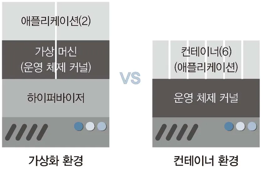 가상화 환경에서는 각각의 가상머신이 모두 독립적인 운영 체제 커널을 가지고 있어야 하기 때문에 그만큼 자원을 더 소모해야 하고 성능이 떨어질 수밖에 없다.