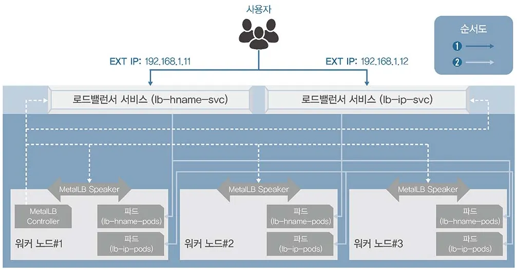 MetalLB 스피커는 정해진 작동 방식(L2/ARP, L3/BGP)에 따라 경로를 만들 수 있도록 네트워크 정보를 광고하고 수집해 각 파드의 경로를 제공