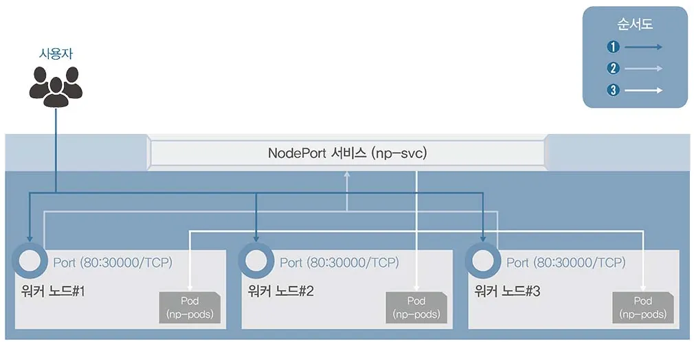 노드포트 서비스를 설정하면 모든 워커 노드의 특정 포트를 열고 여기로 오는 모든 요청을 노드포트 서비스로 전달함