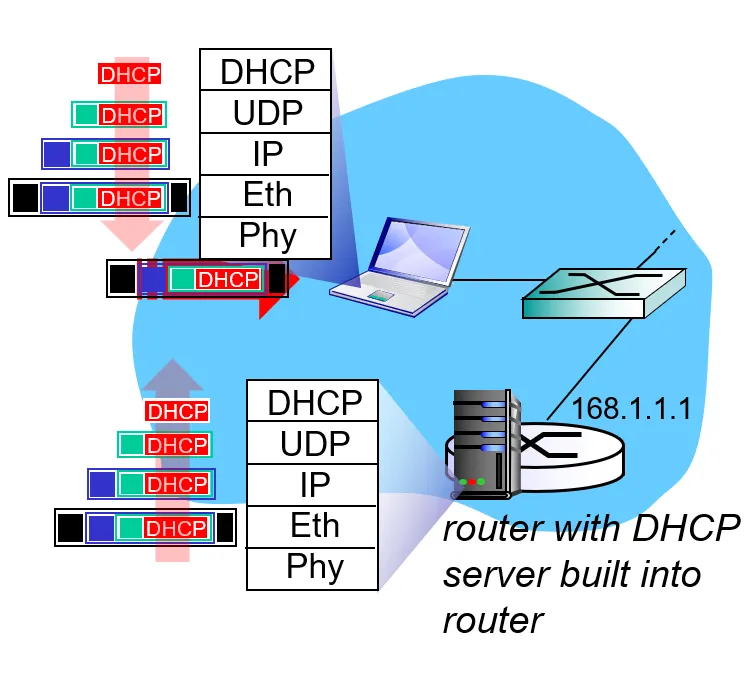 생성된 DHCP request는 랩탑의 protocol stack을 따라 내려가면서 캡슐화됨