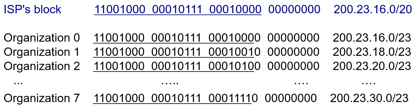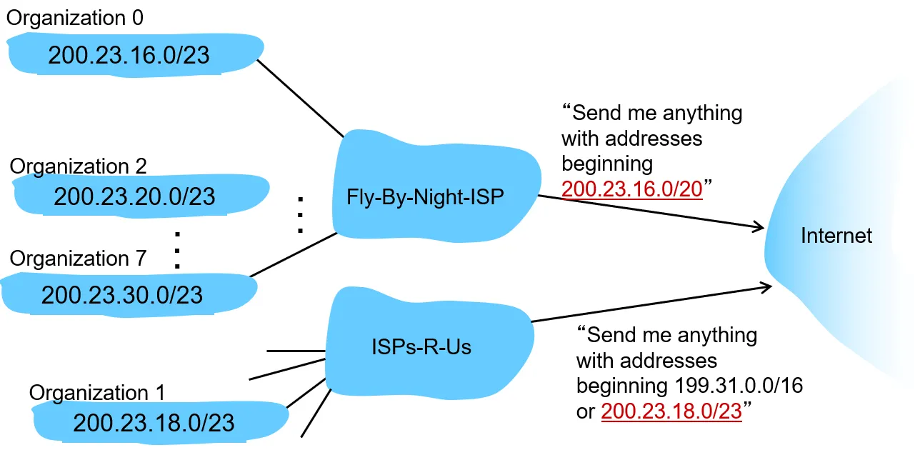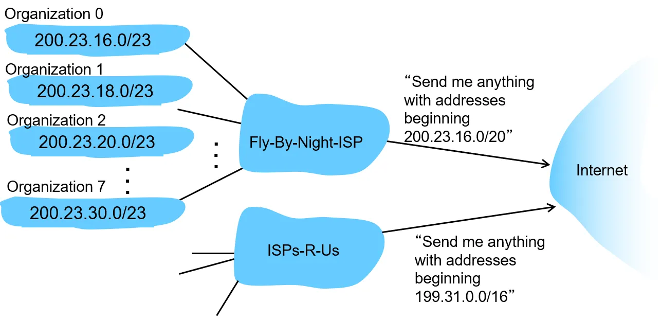 예를 들어 200.23.20.16.0의 첫 20비트로 시작하는건 Fly-By-Night-ISP가 받게 됨