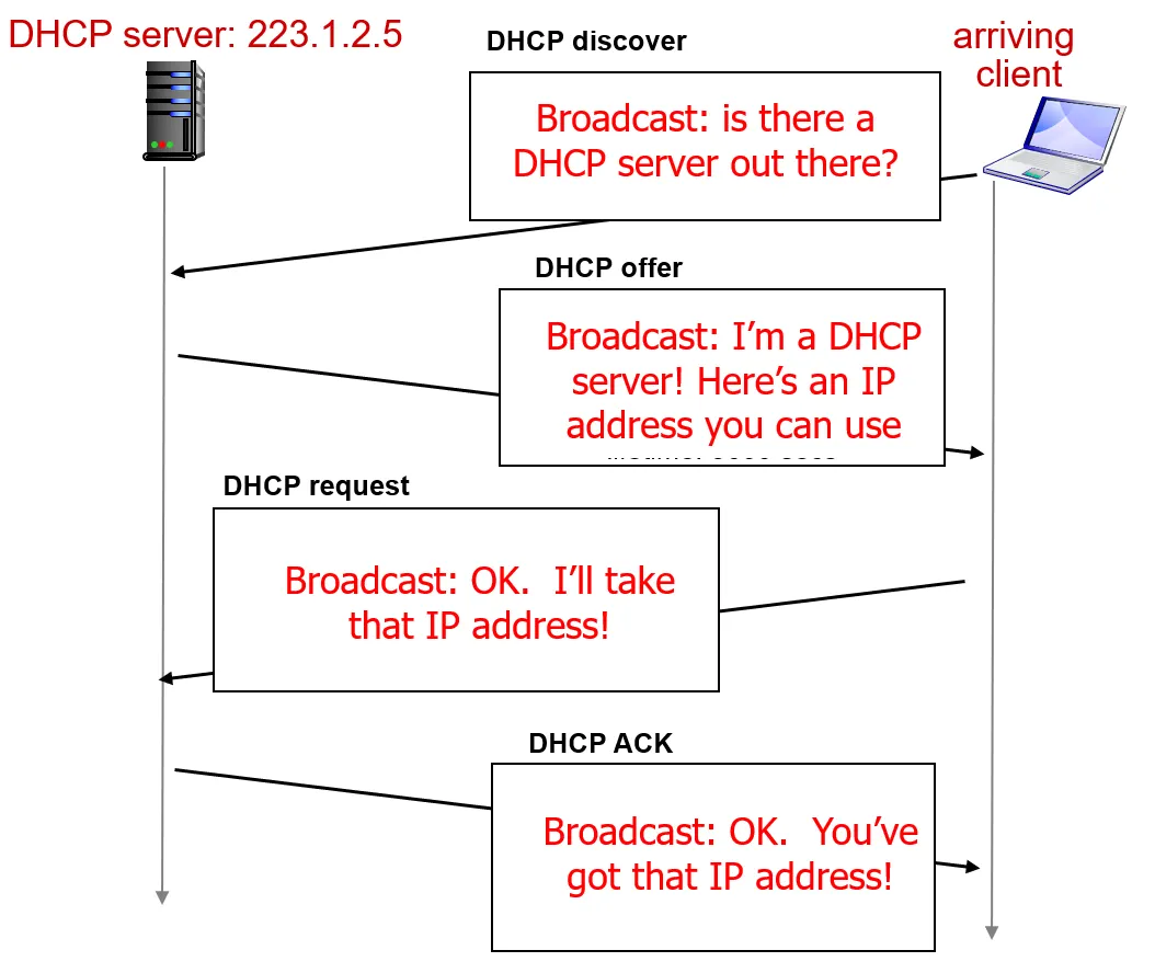 arriving client는 DHCP서버를 발견하기 위해 DHCP discover 메세지를 브로드캐스트함