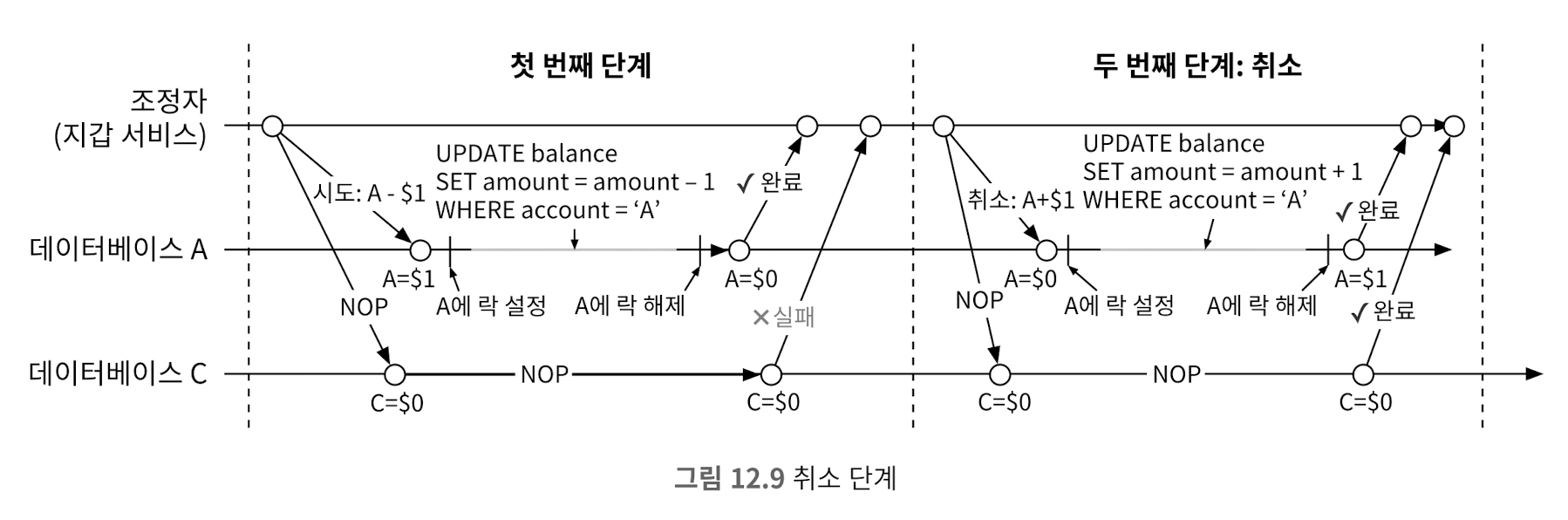 어느 하나라도 ‘아니요’응답 시 조정자는 모든 데이터베이스에 작업 취소를 요청함