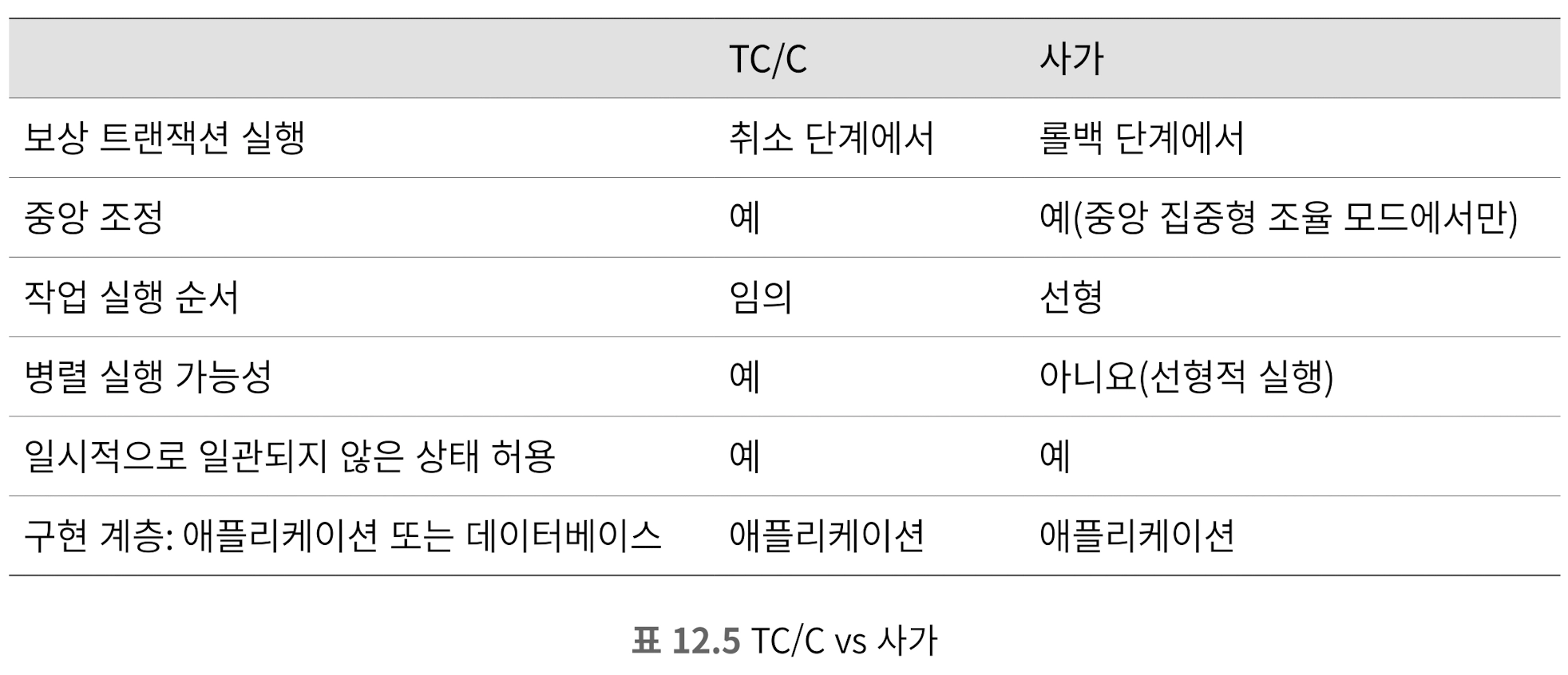 TC/C | 모든 로컬 트랜잭션이 커밋되거나 취소된 상태 | 필요한 경우 새 로컬 트랜잭션 생성 | 이미 커밋된 트랜잭션의 되돌림 (undo) |