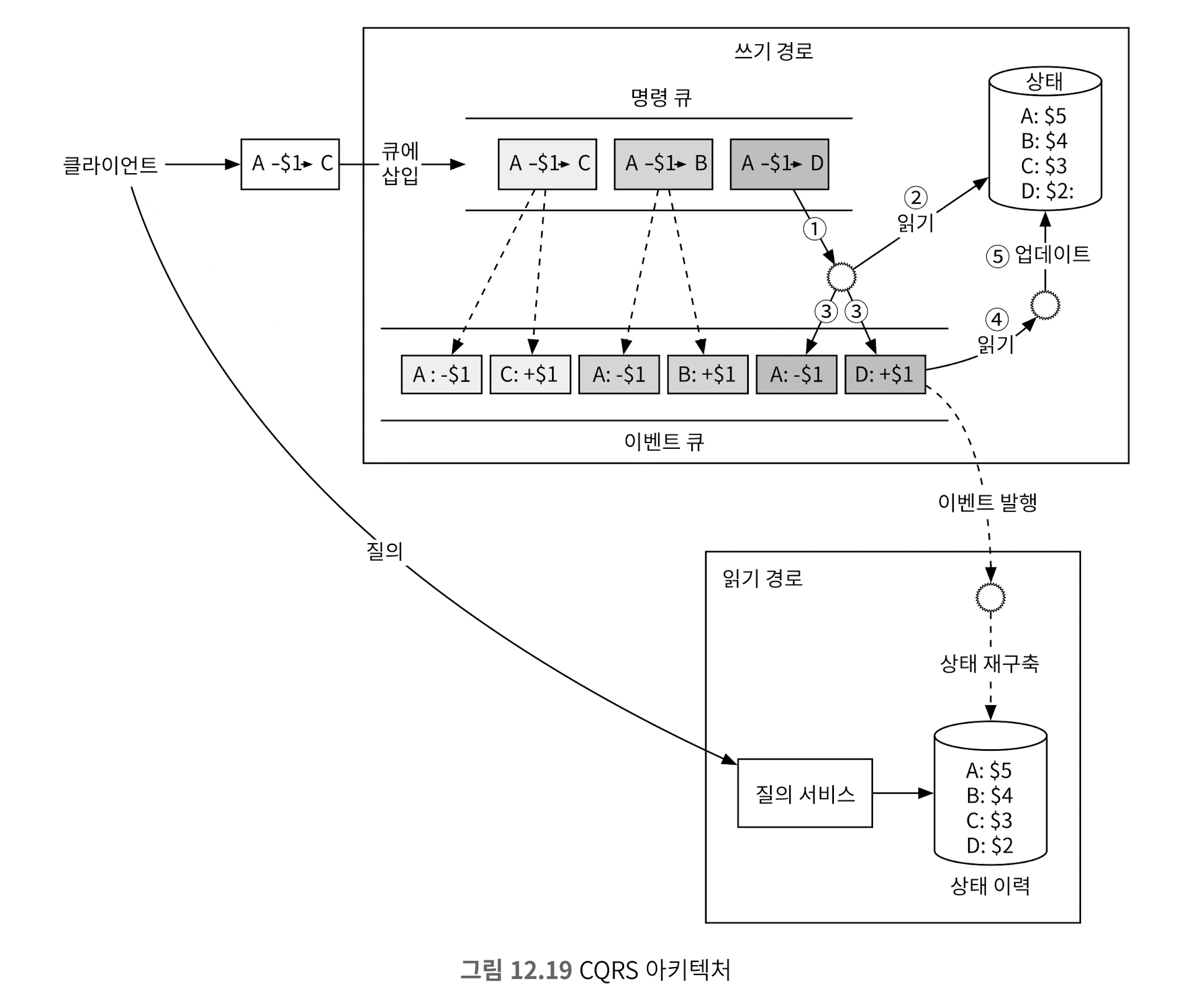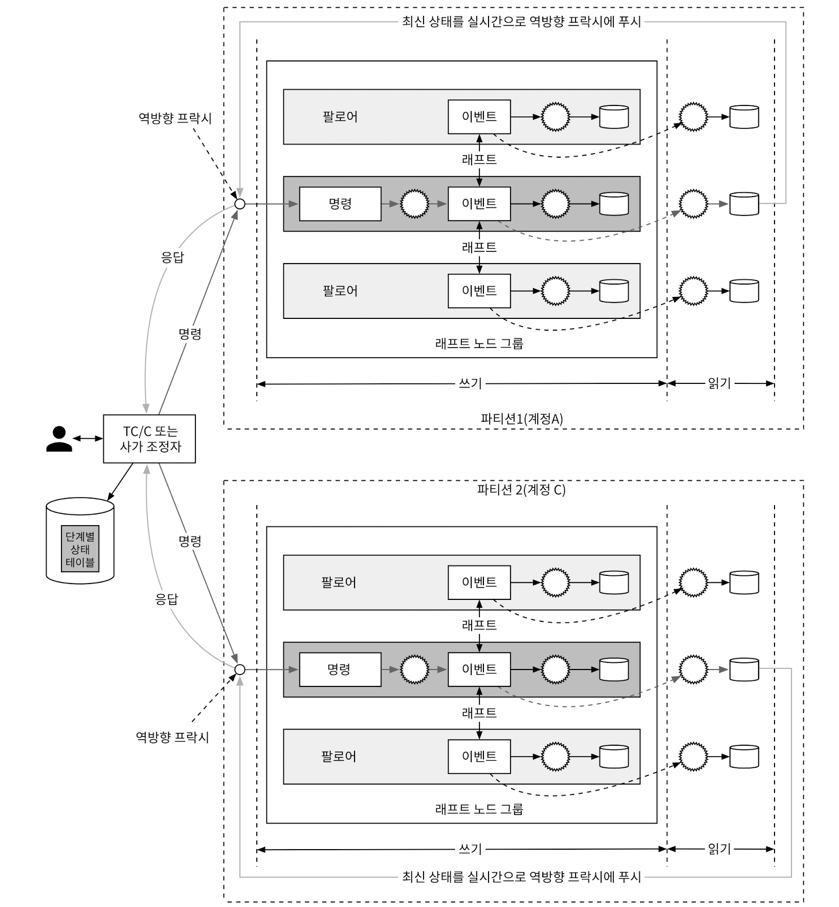 CQRS에서는 상태 기록을 담당하는 상태 기계는 하나고, 읽기 전용 상태기계는 여러개 있을 수 있다.